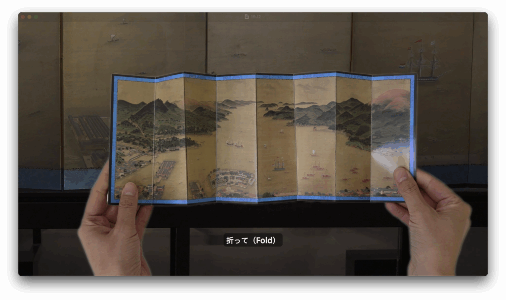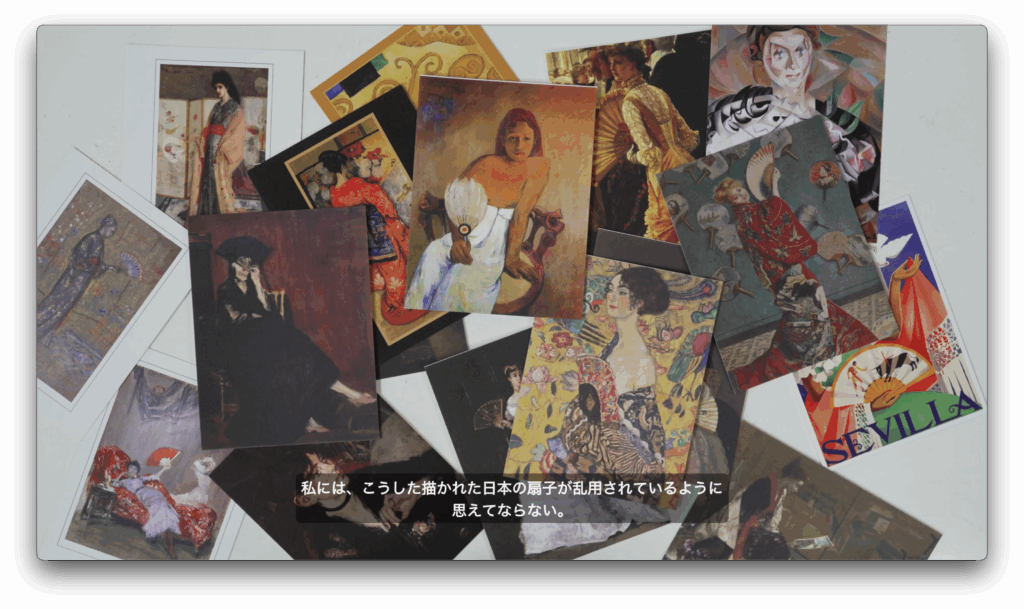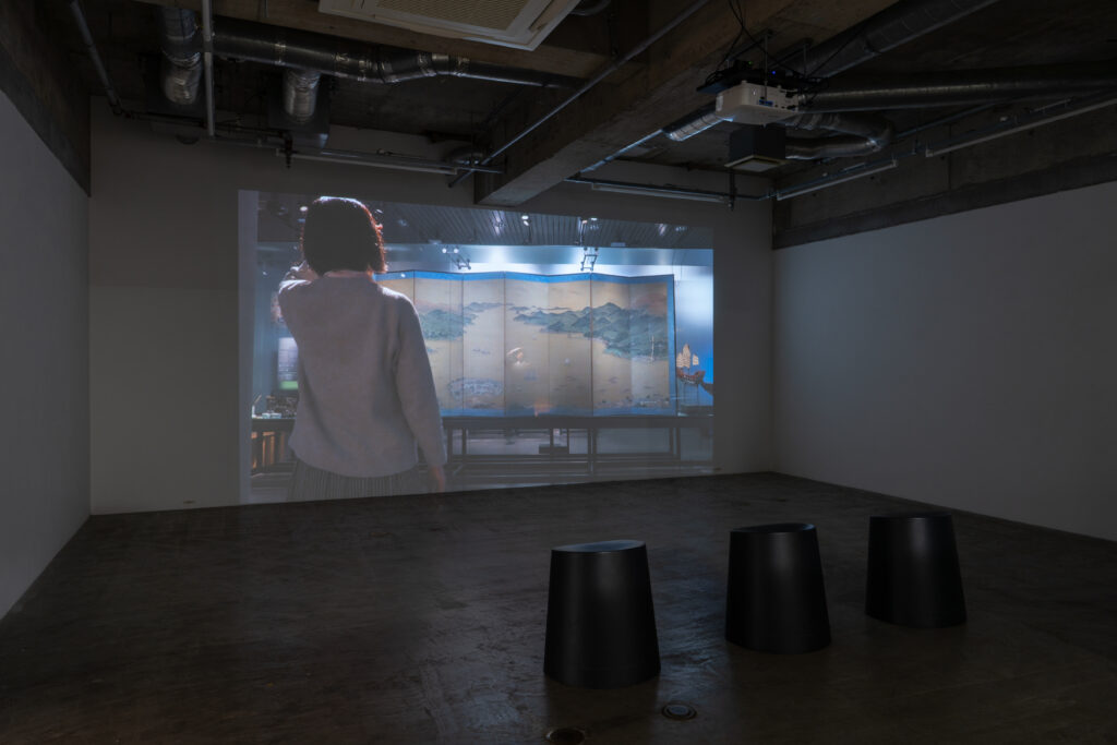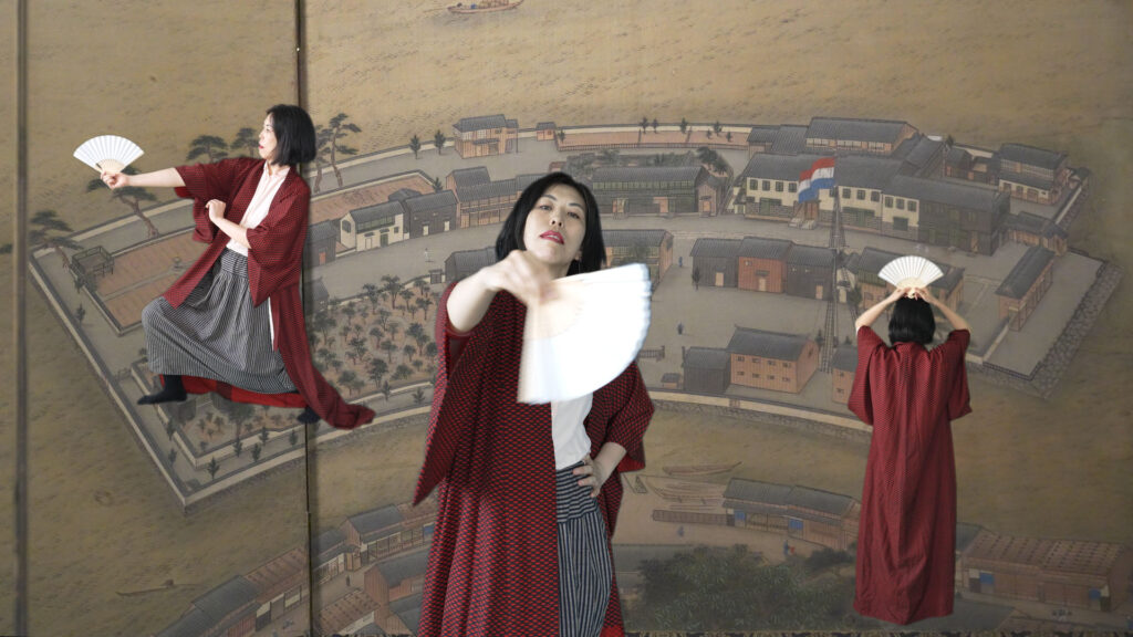 A Japanese woman stands in front of the 19th-century folding screen “View of Dejima in Nagasaki Bay” at the National Museum of Ethnology in Leiden, the Netherlands. She is captivated by the image of Dejima—the Dutch East India Company’s trading post and Japan’s only gateway to the West for over two centuries—which takes the shape of a folding fan. She imagines the fan as a metaphor for Dejima; by opening and closing it, one could control the flow of exchange in history between Japan and the outside world. What if that “gate” to the West had remained closed? How might Japan’s culture and economy have evolved—and what would it mean for her, a Japanese woman living in the Netherlands?