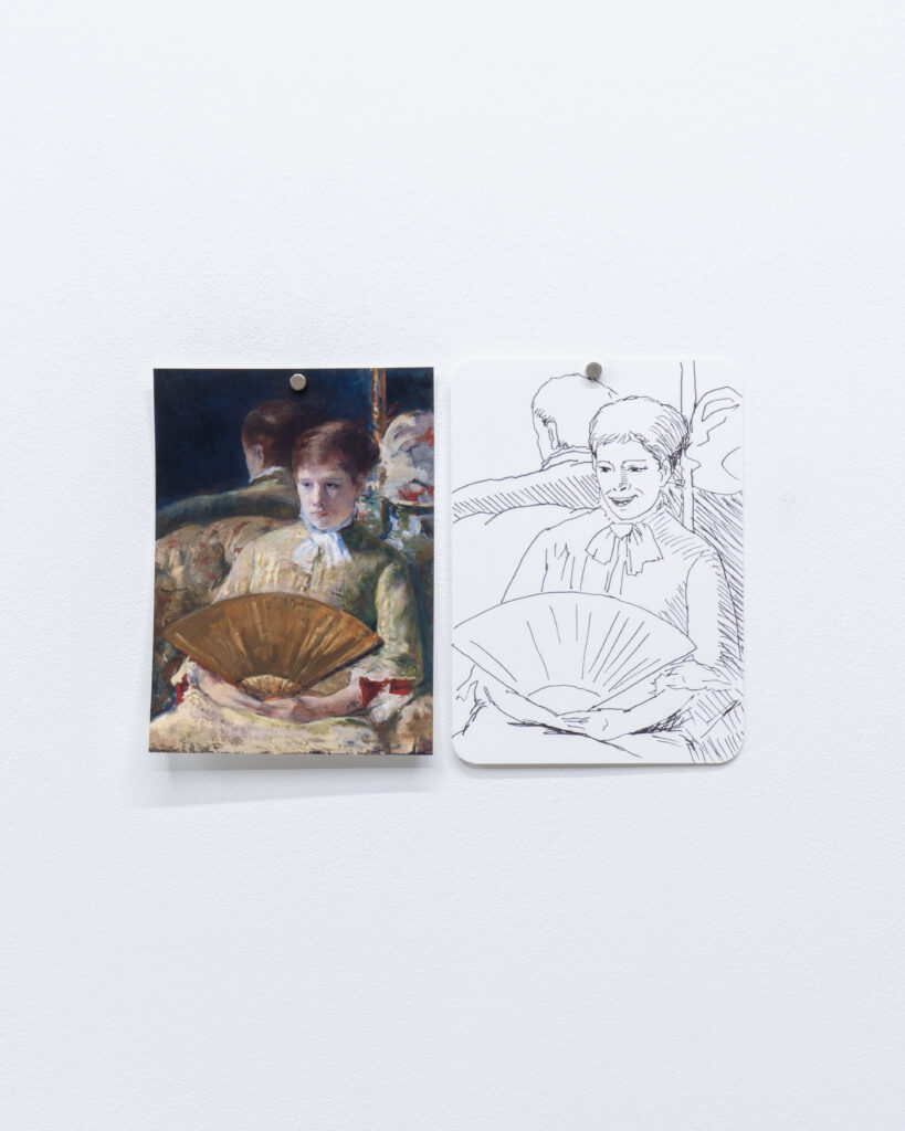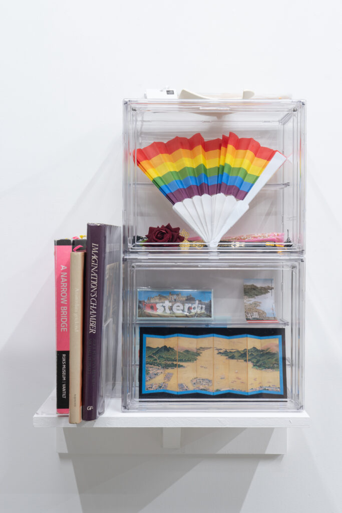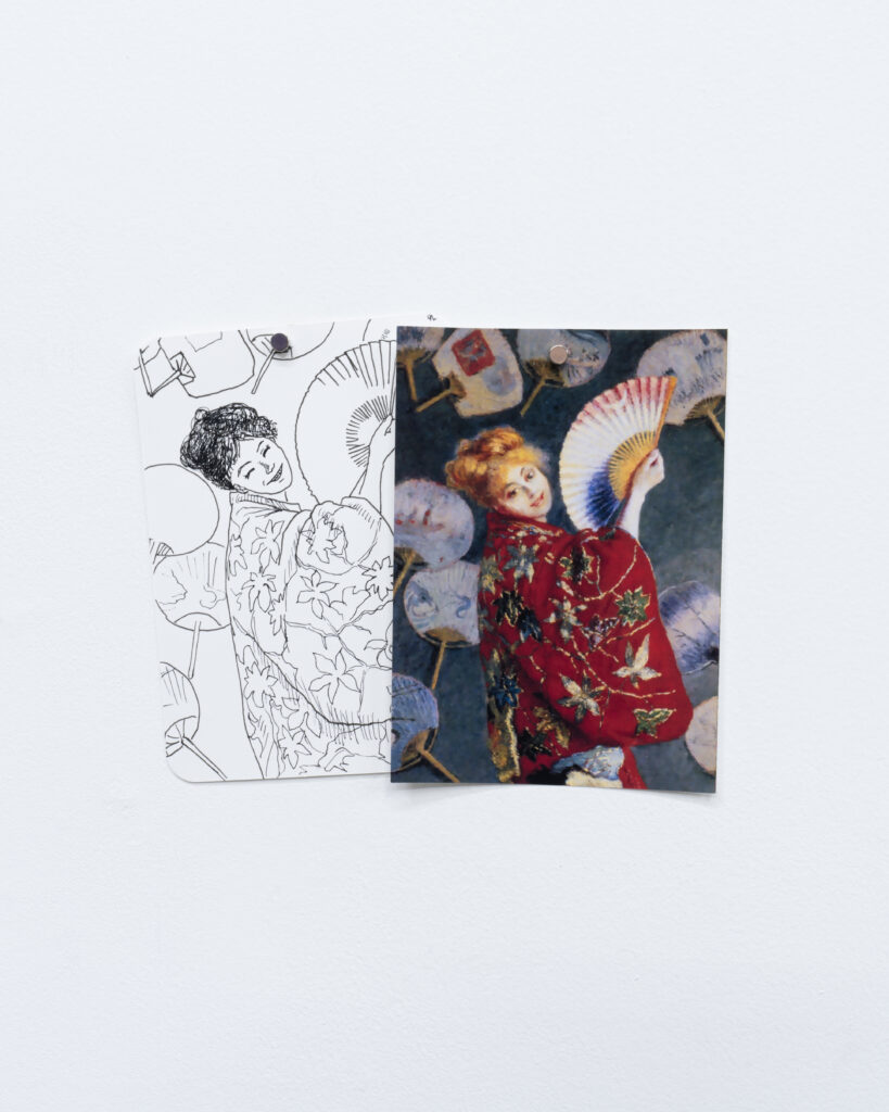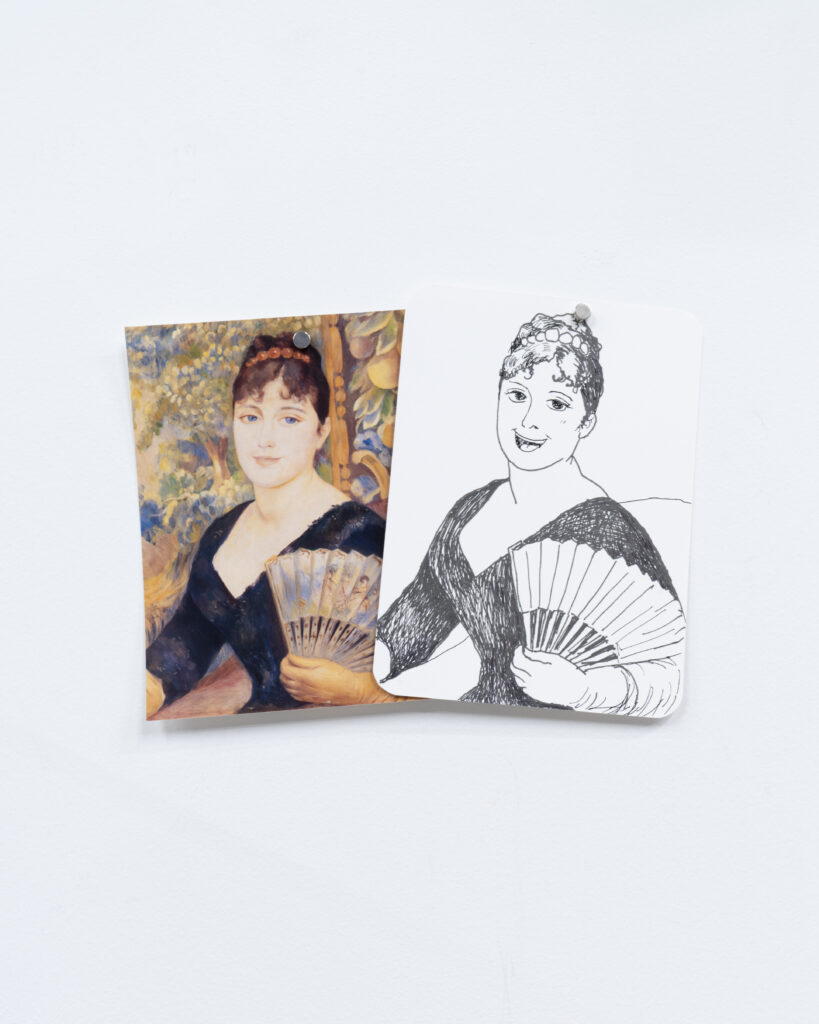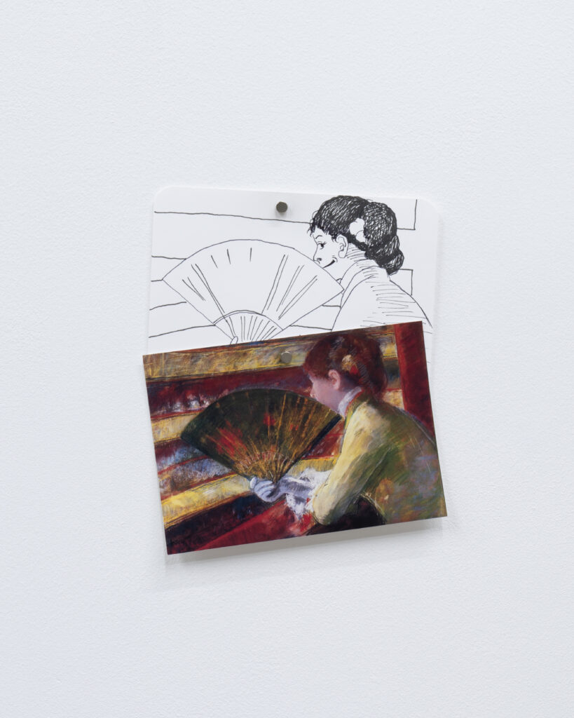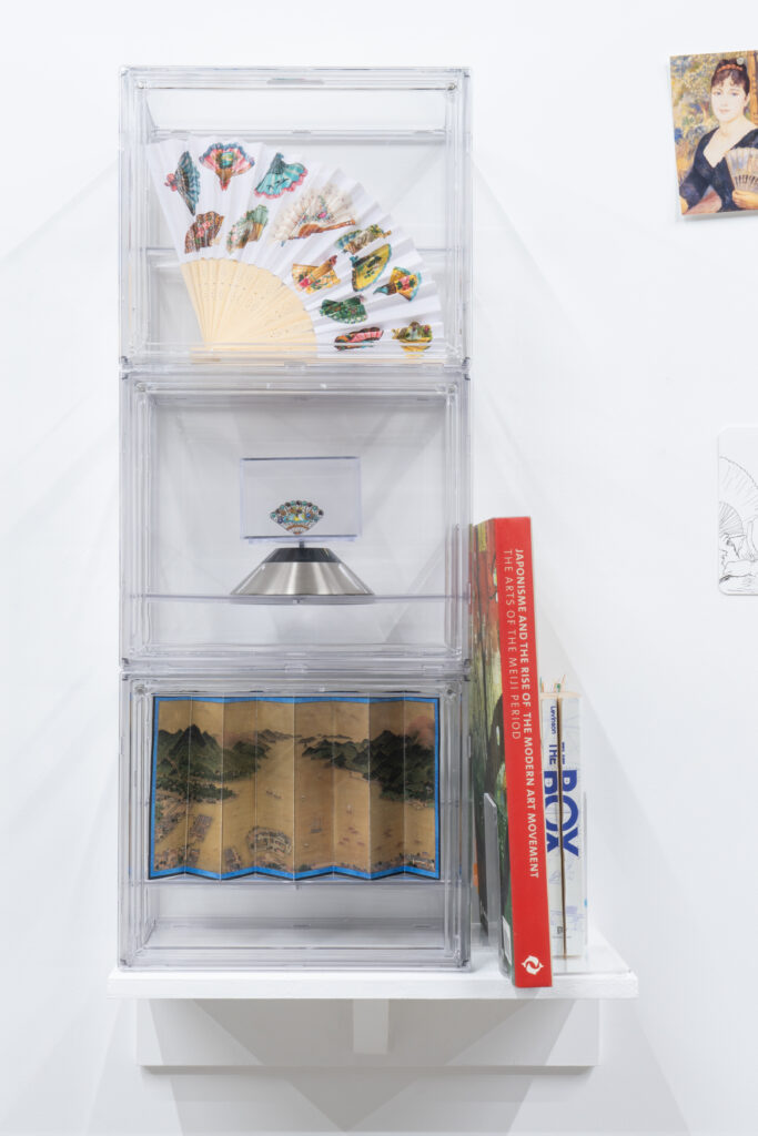 View of Dejima に登場した有名絵画に現れる扇子を持った女性を笑顔に変換したドローイング作品と、同作中で使用された小道具や資料を合わせたインスタレーション。