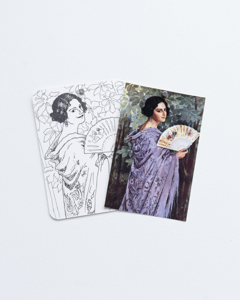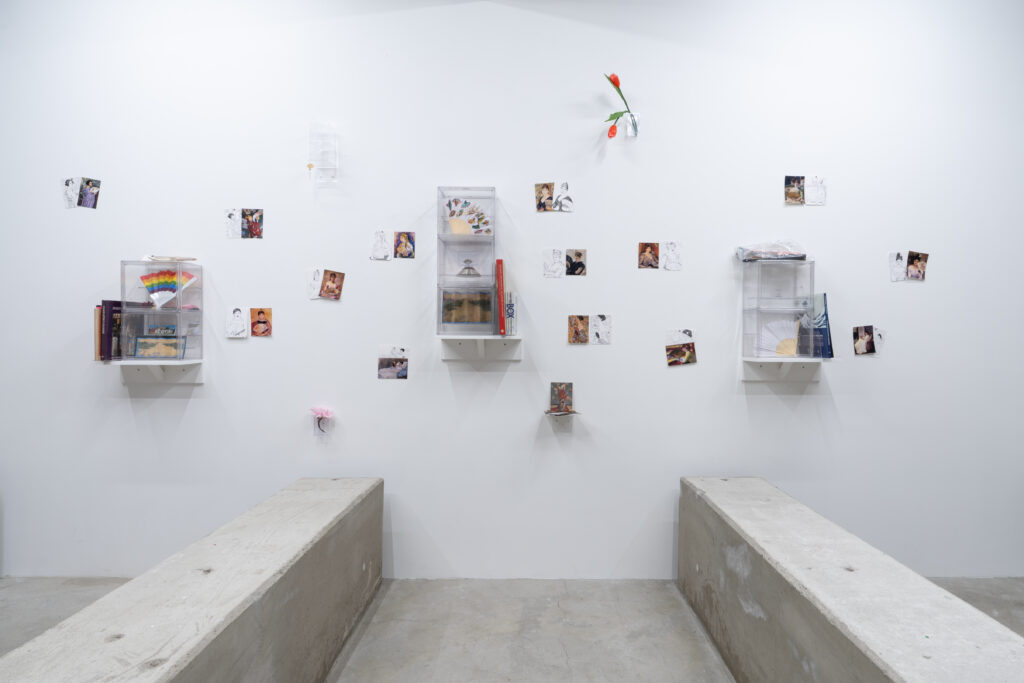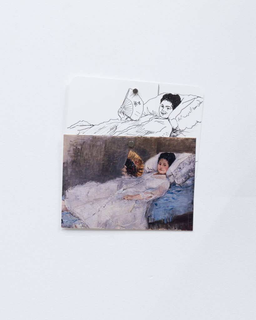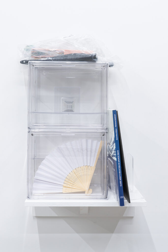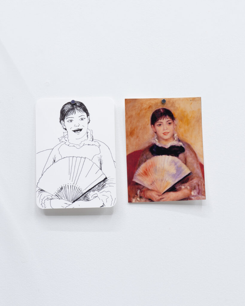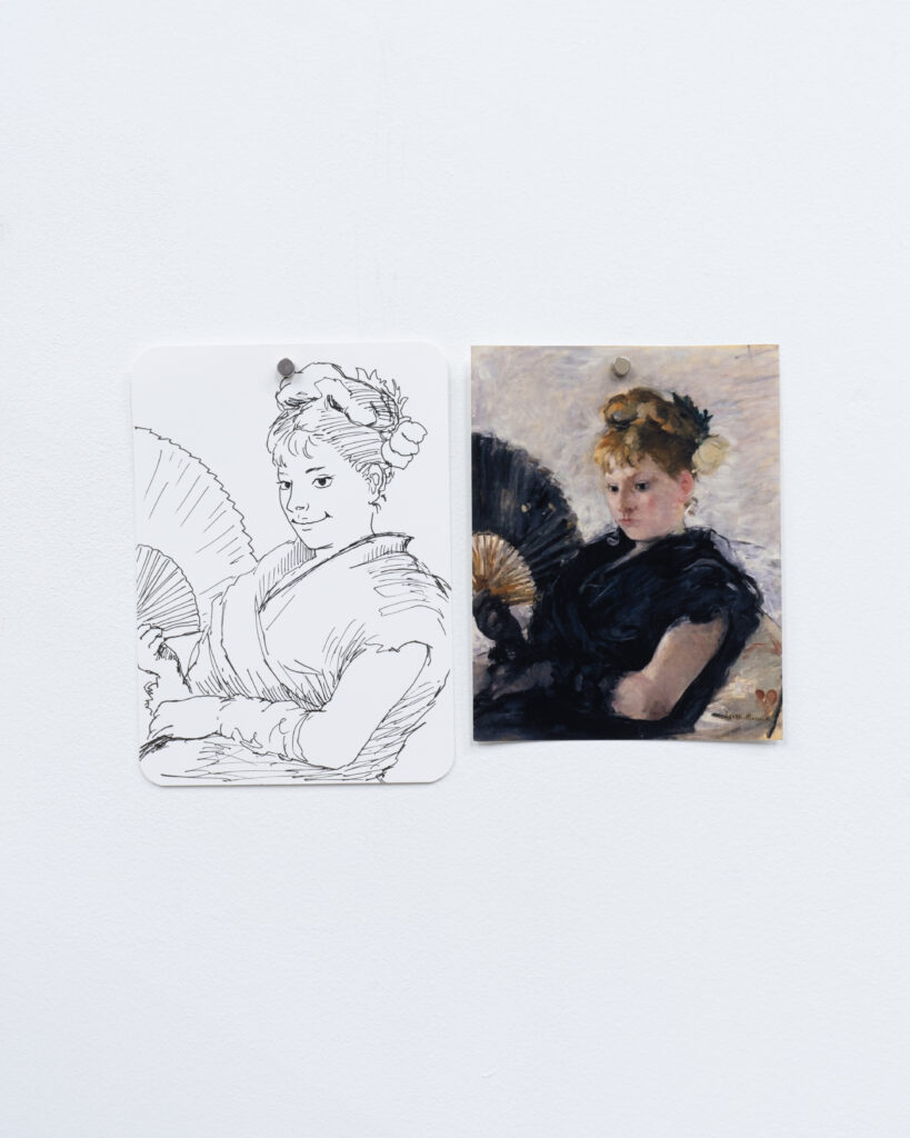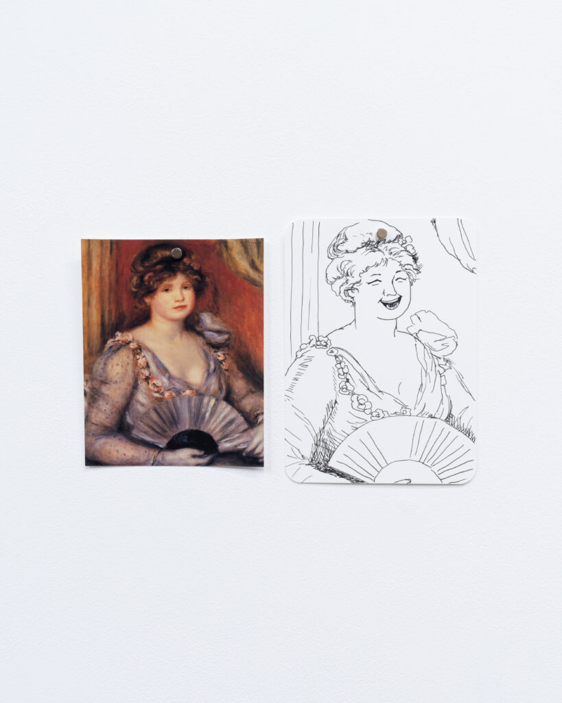 View of Dejima に登場した有名絵画に現れる扇子を持った女性を笑顔に変換したドローイング作品と、同作中で使用された小道具や資料を合わせたインスタレーション。