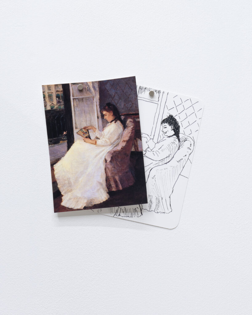 An installation combines the props and reference materials used in the film “View of Dejima,” with drawings that transform the well-known paintings of women with fans, as seen in the film, into smiling figures. Visitors are welcome to pick up and explore the props and materials.